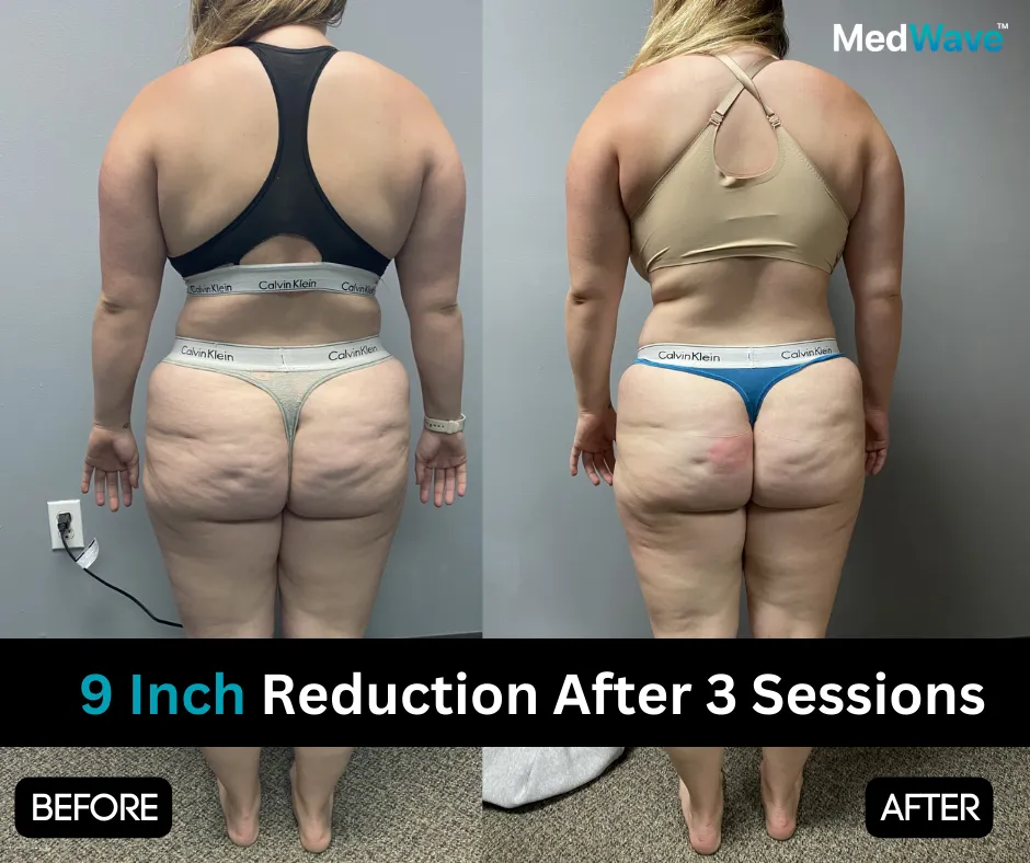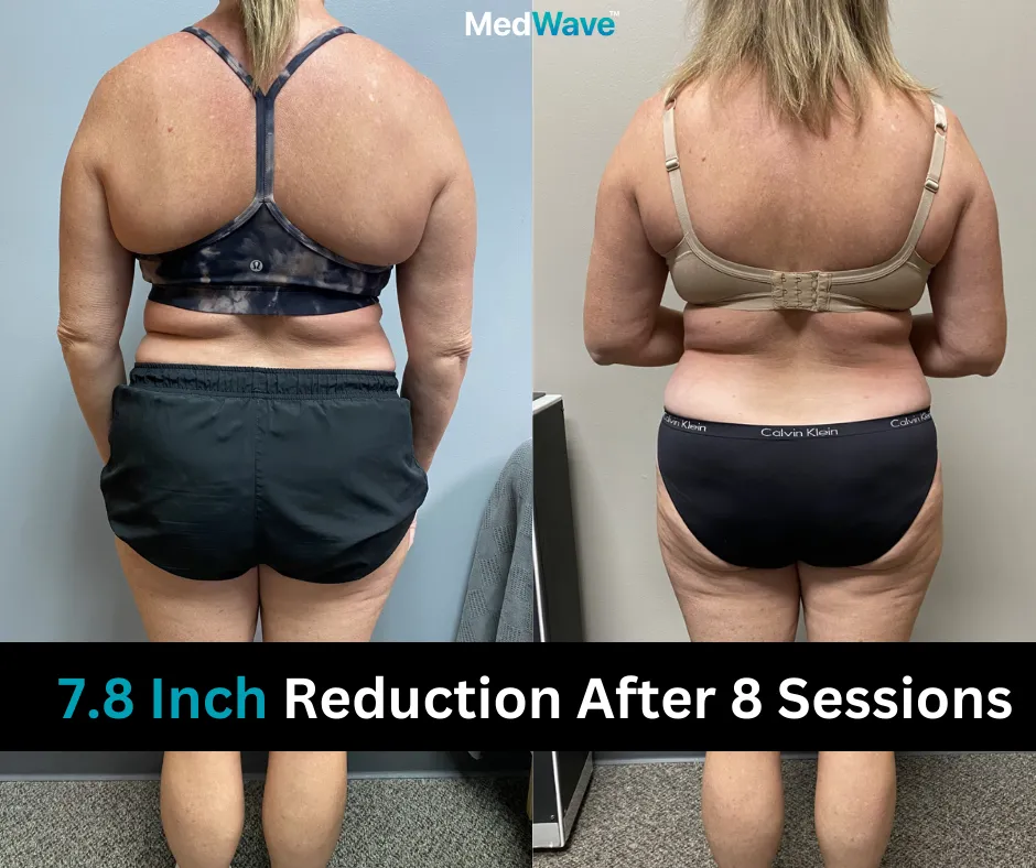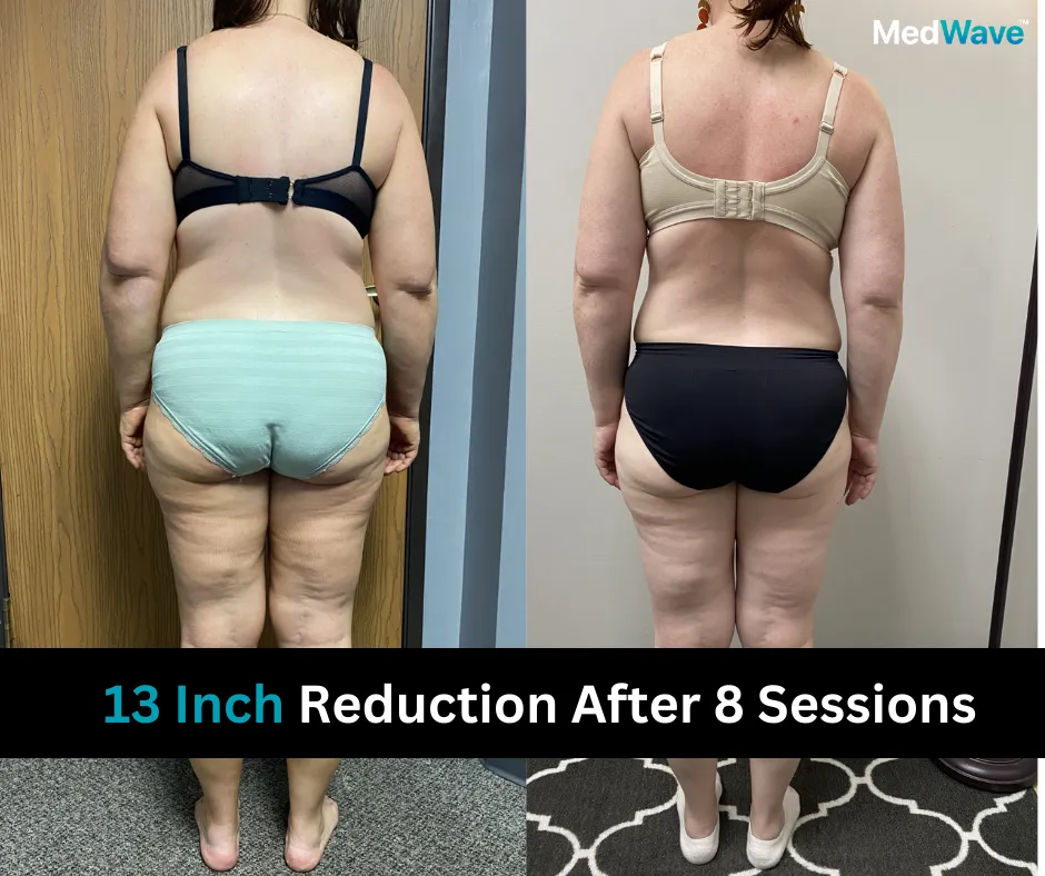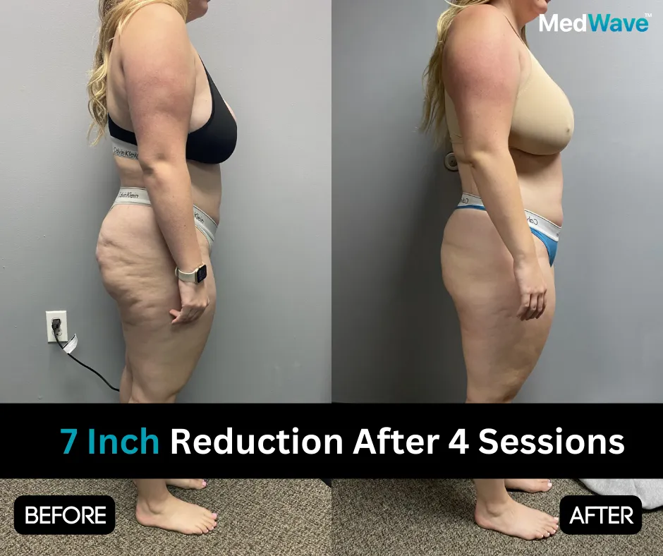 Similarly, when focusing on other areas like the arms and thighs, a single spot measurement before and after a 30-minute session reveals an average inch loss of .5 to 1 inch.